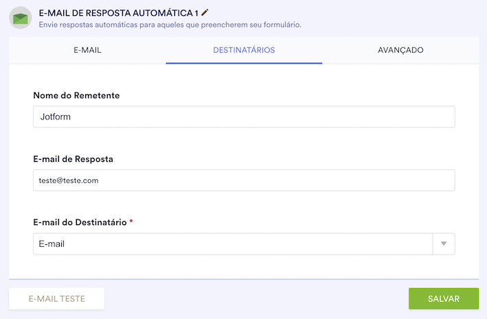 - E-mail de Resposta — O endereço de e-mail para o qual as respostas serão enviadas.