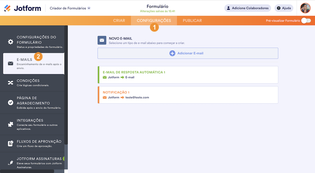 Siga os seguintes passos para visualizar as notificações por e-mail e os e-mails automáticos configurados no seu formulário: