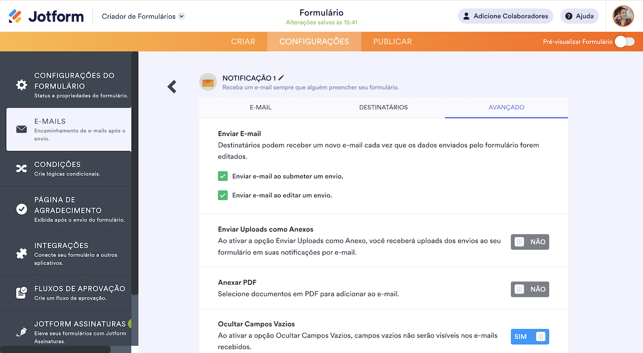- Avançado — Acesse configurações adicionais para seus e-mails de notificação e de resposta automática.