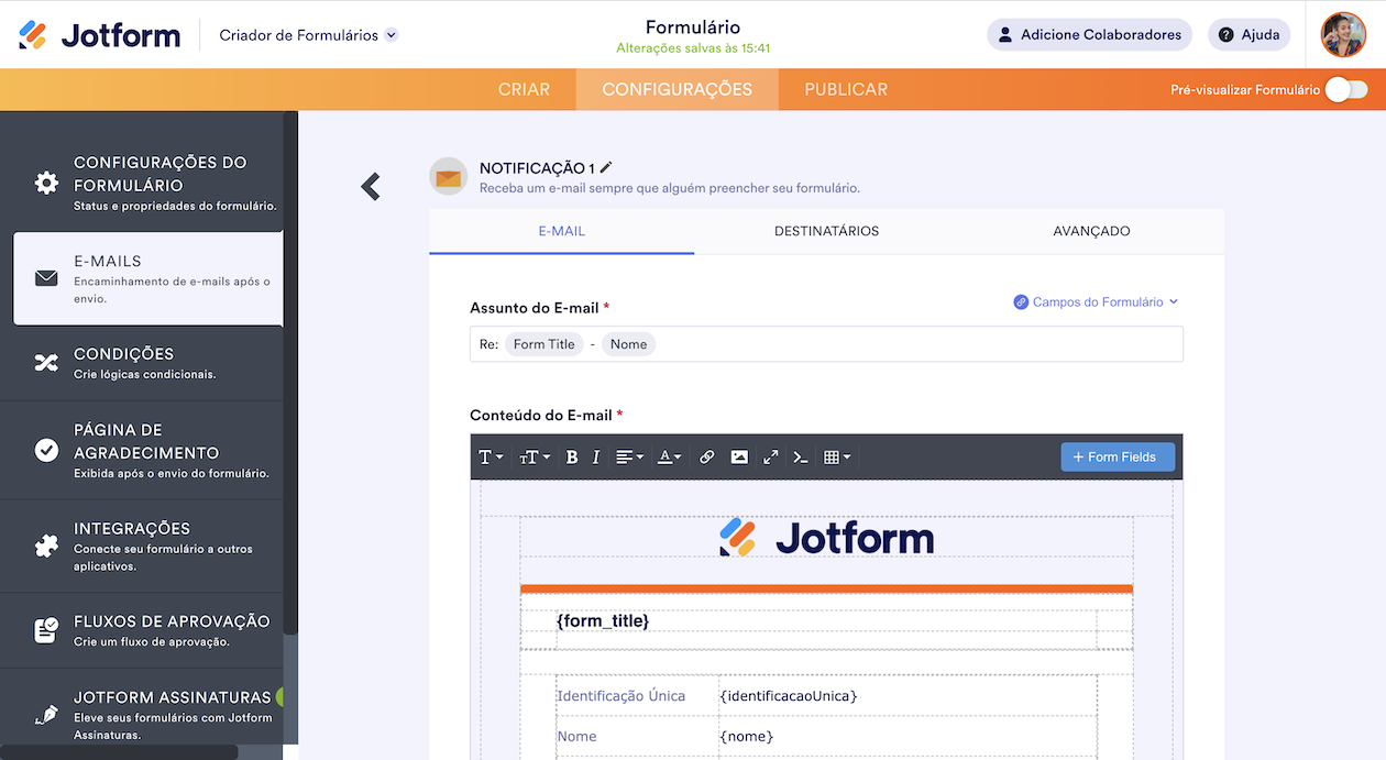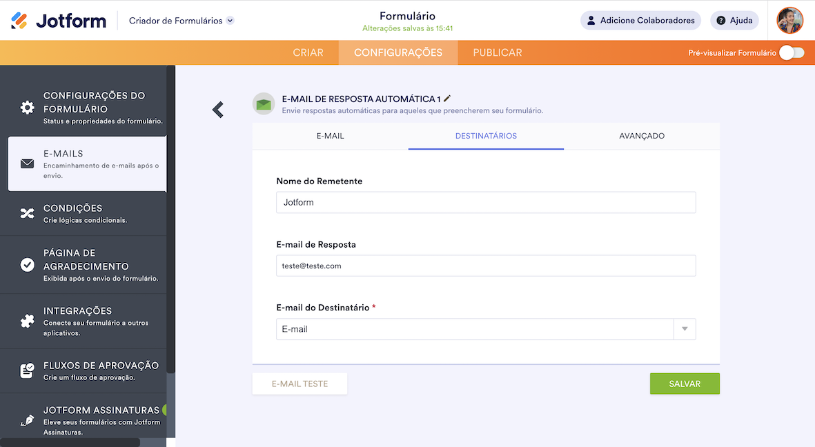- E-mail do Destinatário — Defina o endereço que receberá o e-mail de notificação ou de resposta automática após o envio do formulário.
