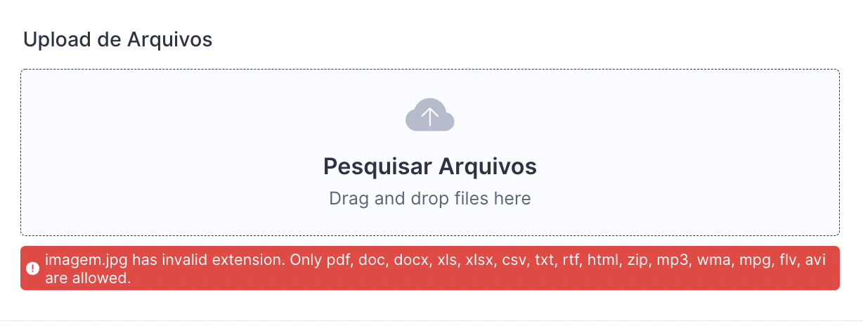 Caso seja feito o upload de um arquivo com tipo não permitido, o elemento exibirá uma mensagem de erro.
