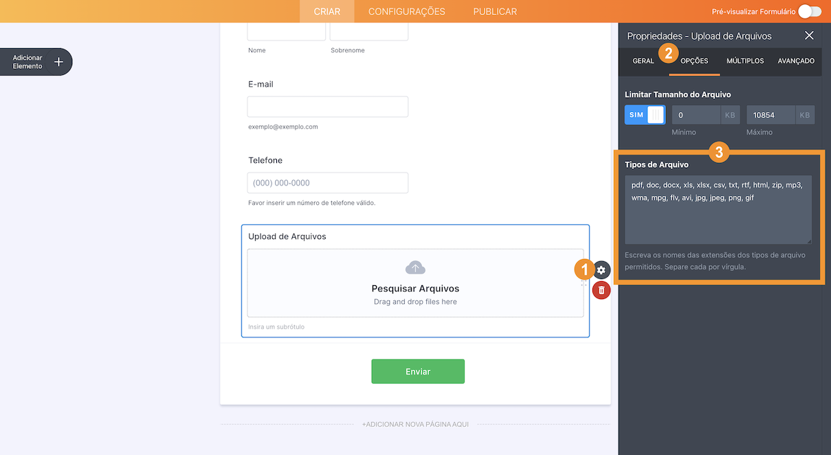 Nossos usuários frequentemente se perguntam quais tipos de arquivo são permitidos no campo de Upload de Arquivos. As extensões aceitas são, por padrão: