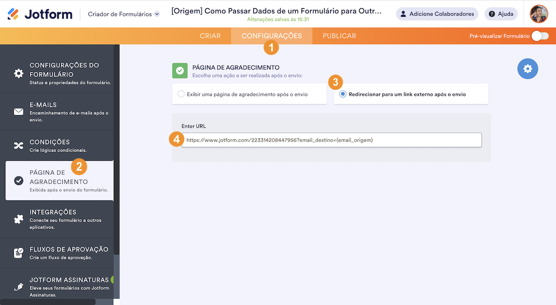 Os preenchedores do formulário serão redirecionados automaticamente para a página de destino após o envio. Para configurar: