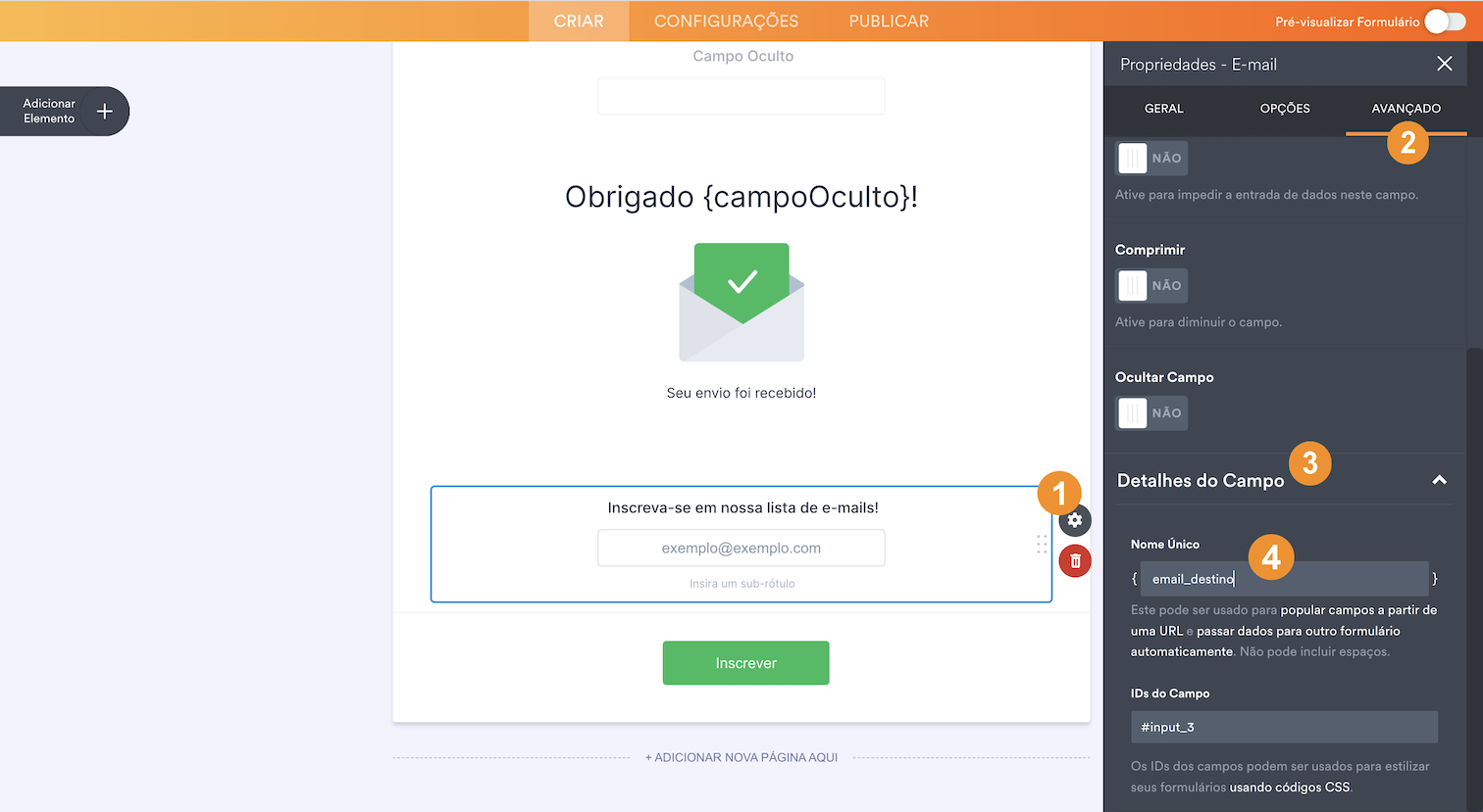 - {email_origem} – o nome único do elemento de E-mail do formulário de origem como valor.