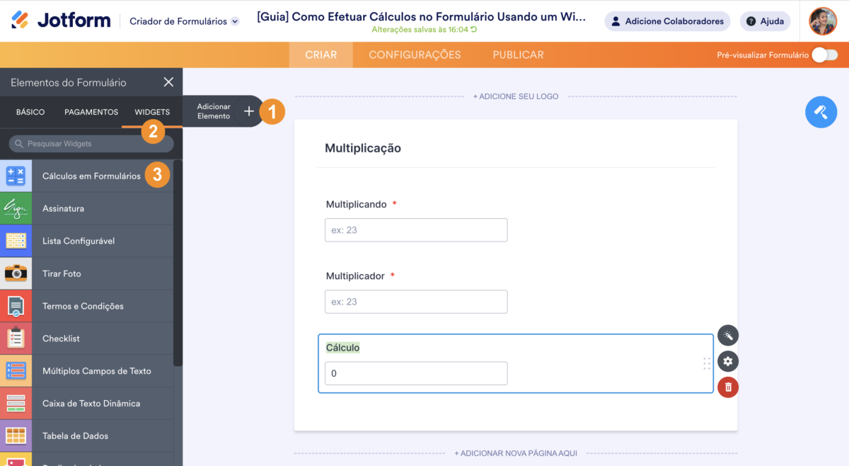 Para adicionar o widget Cálculos em Formulários…