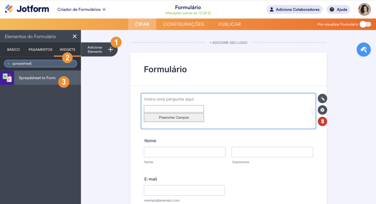 - Pesquise e selecione o widget Spreadsheet to Form.