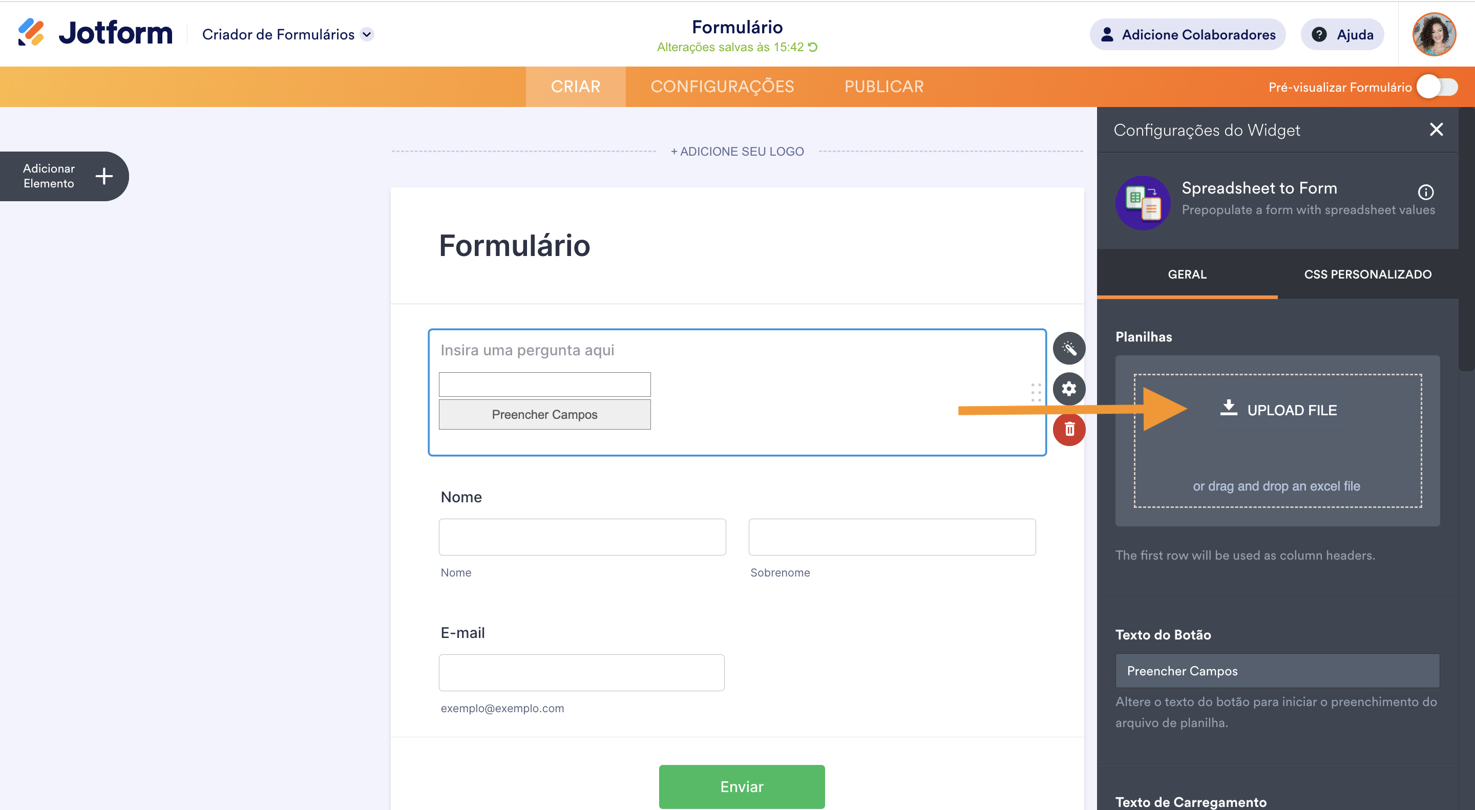 - Clique na caixa Enviar Arquivo no painel de configurações do widget.