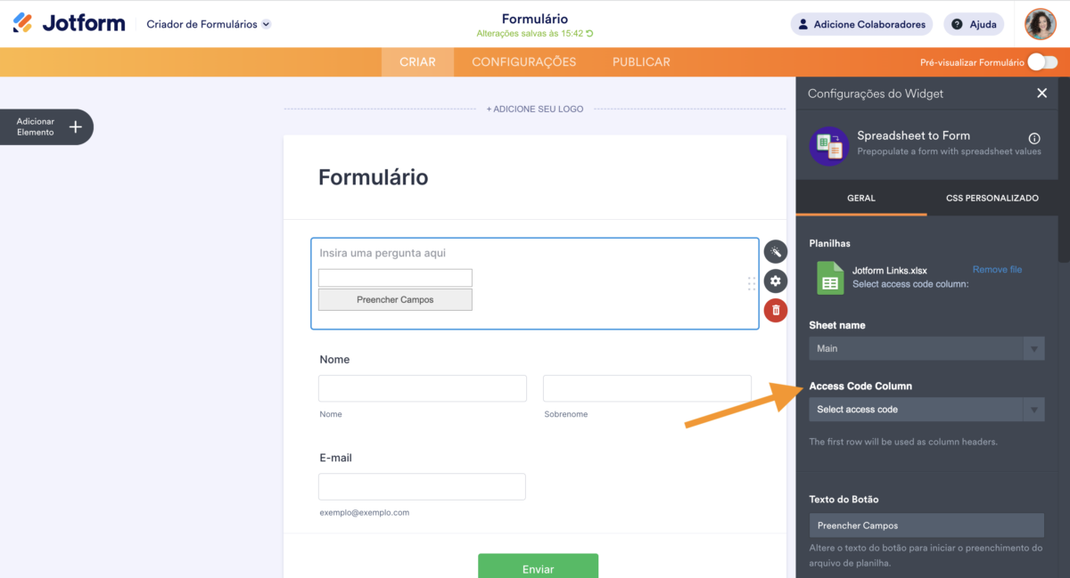 - Selecione a Coluna do Código de Acesso a partir do menu suspenso. O widget também solicitará o Nome da Planilha caso a planilha enviada tenha mais de uma guia.