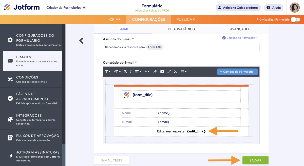{edit_link}ao Conteúdo do E-mail. - Role até o final e clique no botão Salvar.