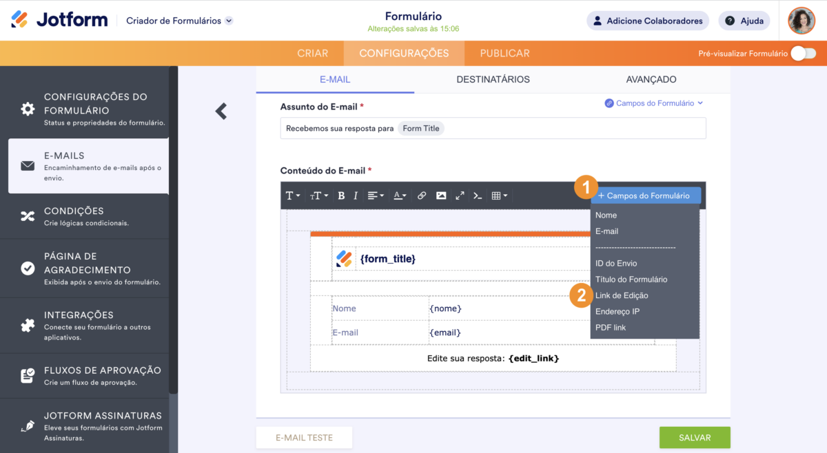 Você também pode adicionar a tag {edit_link} ao Conteúdo do E-mail clicando no botão Campos do Formulário na barra de ferramentas e selecionando a opção Link de Edição.
