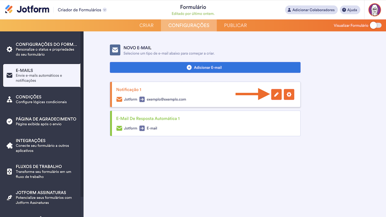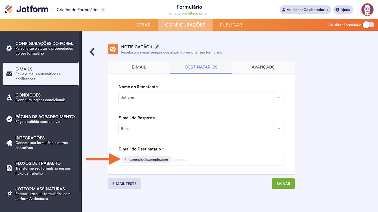 - O botão E-mail Teste enviará a notificação apenas para o endereço de e-mail associado à sua conta. Para testar os destinatários de e-mail em sua notificação, você pode realizar um envio teste ao seu formulário.