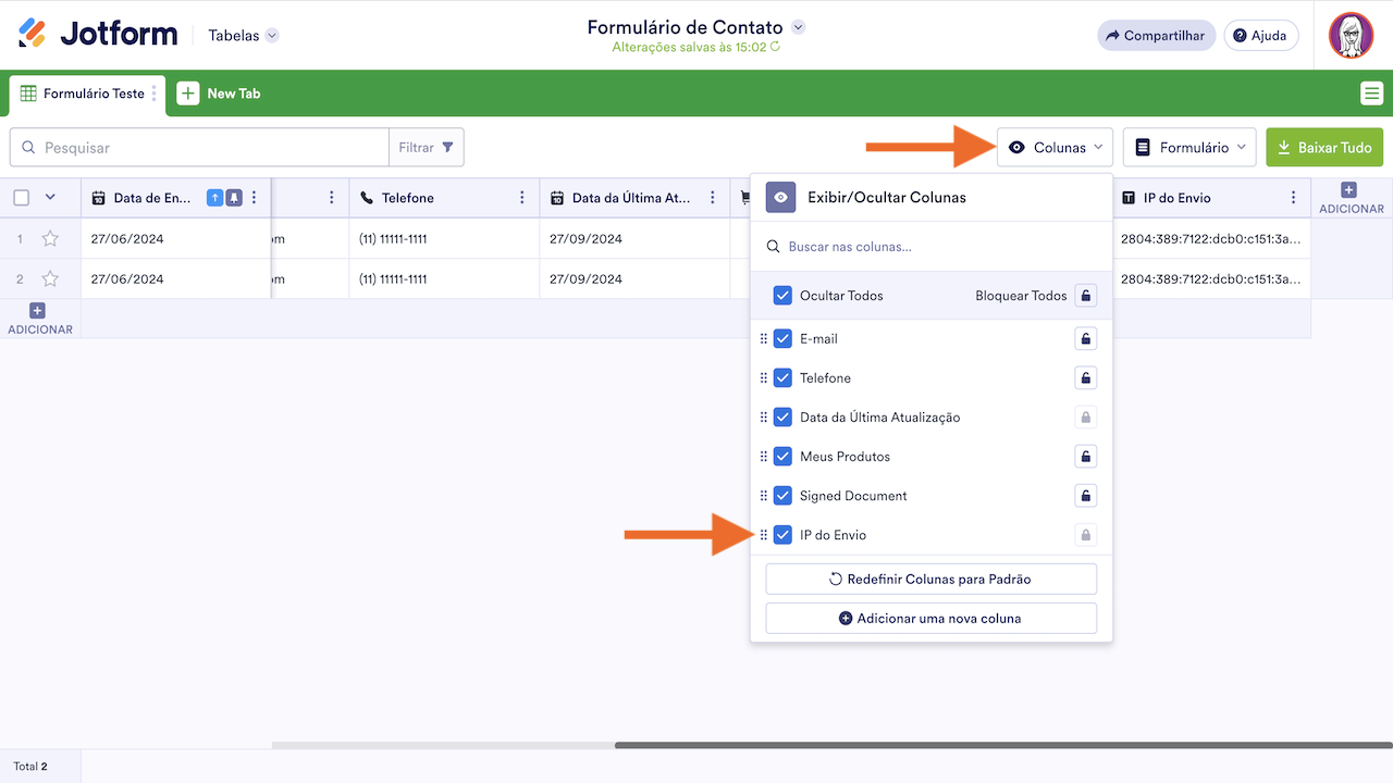 Visualizando o IP do Envio no Jotform Tabelas