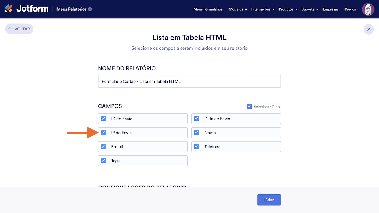 Com os Relatórios Jotform, você pode incluir o IP do Envio no relatório do formulário durante sua configuração. Para incluir o endereço de IP em seu relatório: