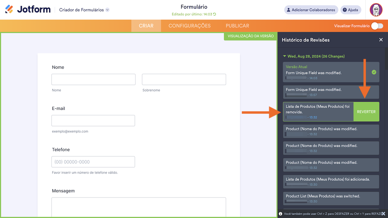 O Histórico de Revisões do formulário permite que você visualize e gerencie as alterações realizadas em seus formulários. Esta ferramenta registra todas as modificações, fornecendo um registro detalhado que pode ser revisado e revertido, se necessário.
