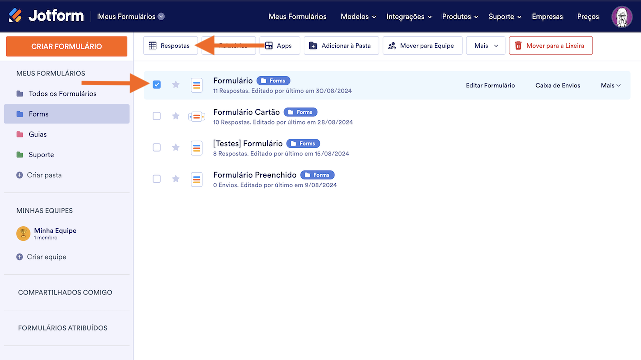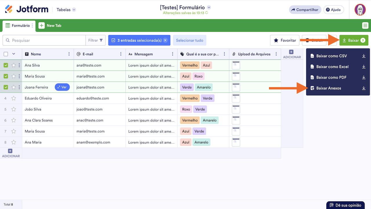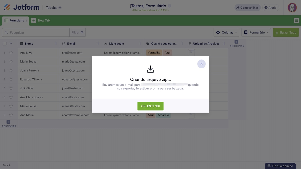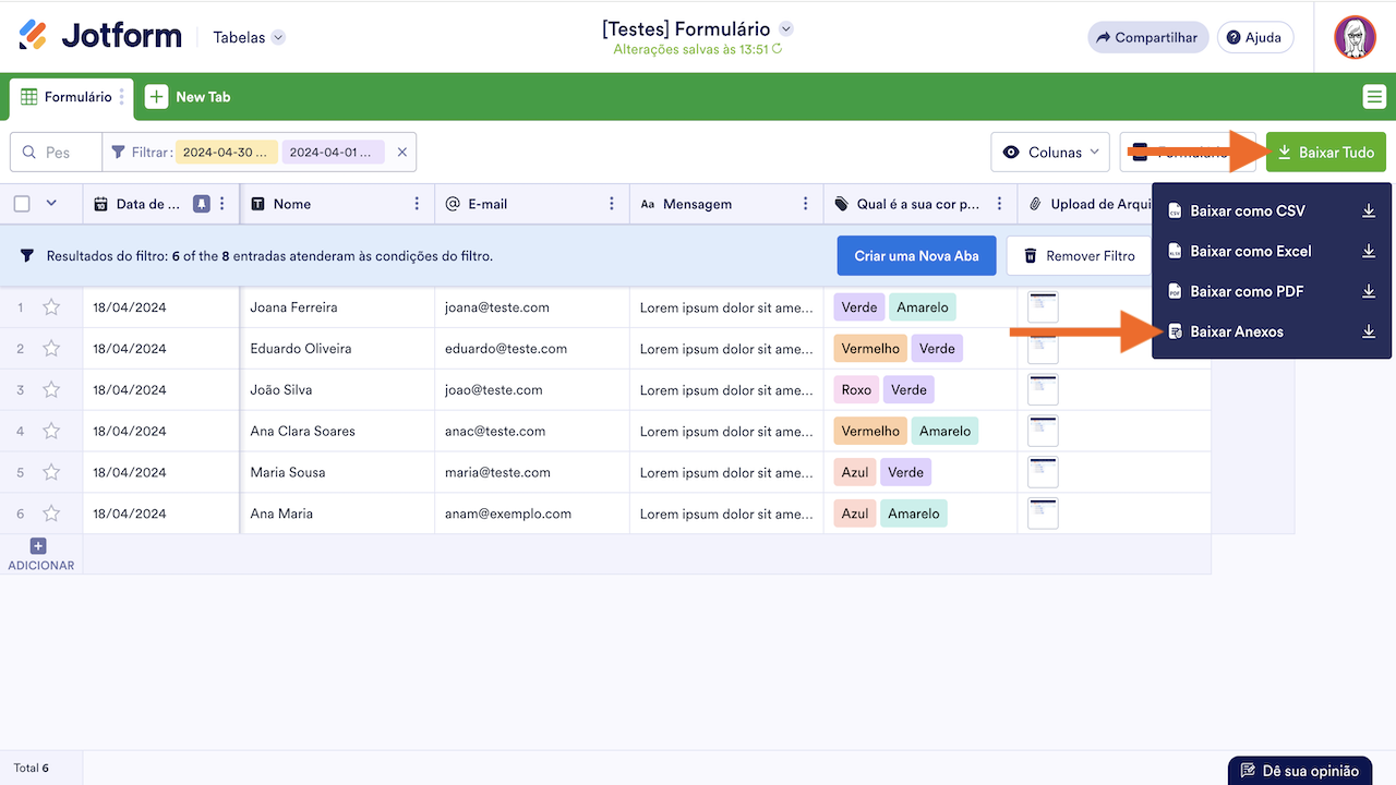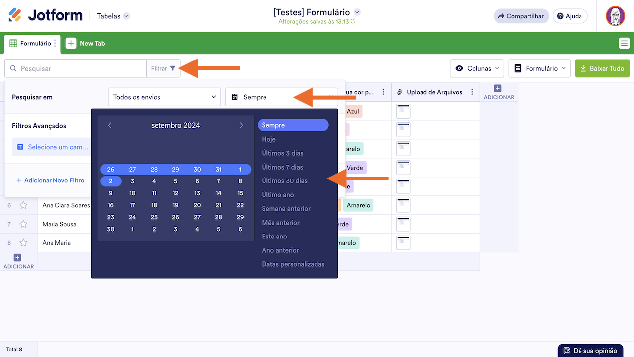 O download de arquivos com base em um intervalo de tempo é feito filtrando os envios no Jotform Tabelas. Veja como: