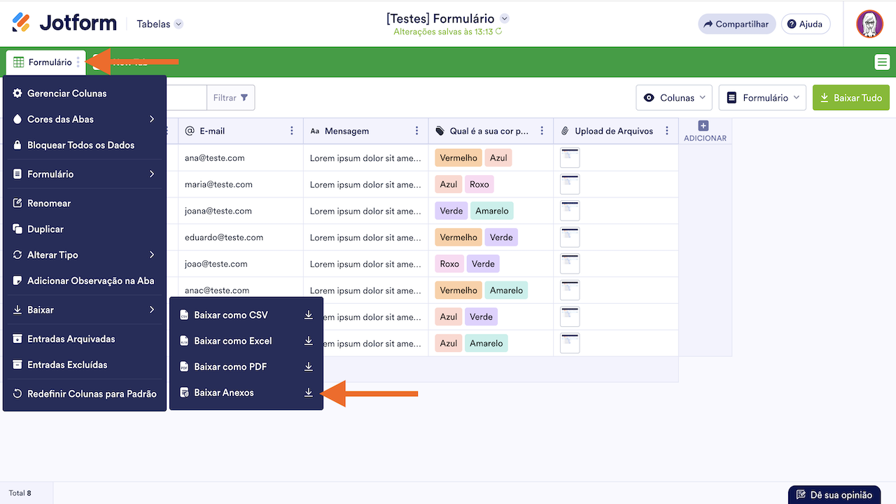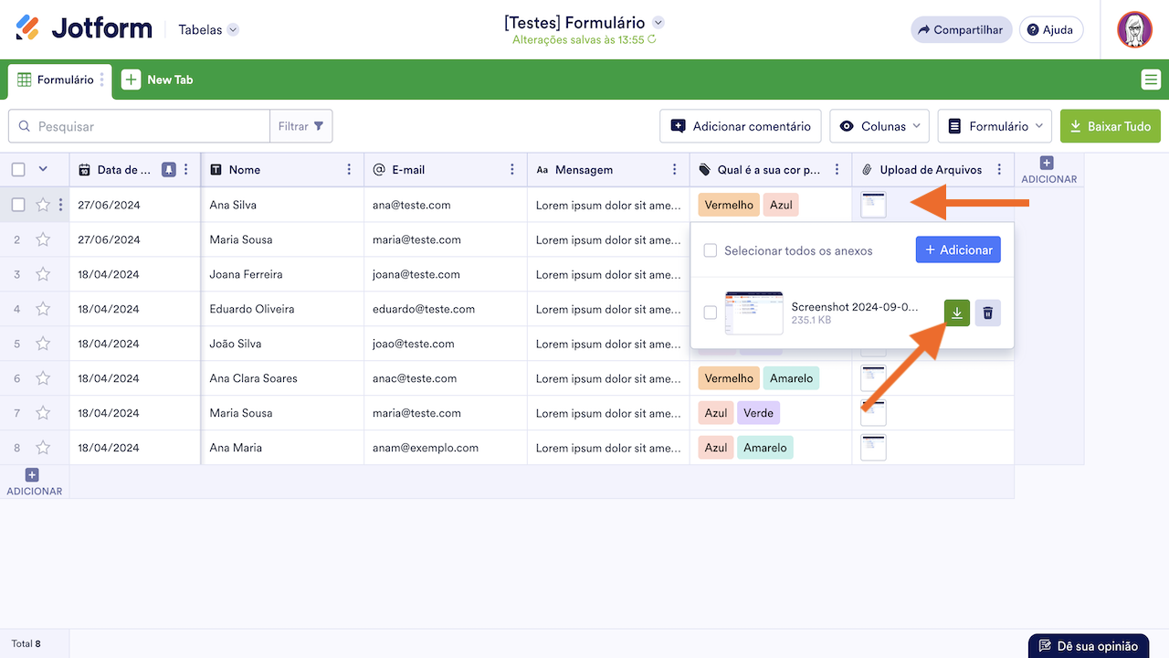 Você pode fazer o download de todos os arquivos enviados através do Jotform Tabelas ou da Caixa de Envios Jotform. Veja como fazê-lo usando o Jotform Tabelas:
