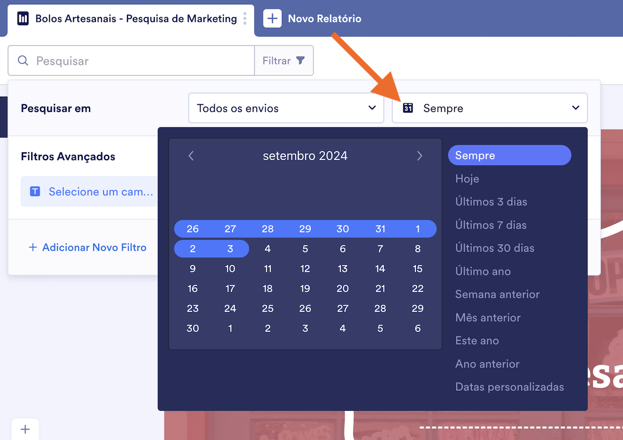 Para visualizar os relatórios de envios ao seu formulário realizados em datas específicas, você pode filtrá-los por Data de Envio: