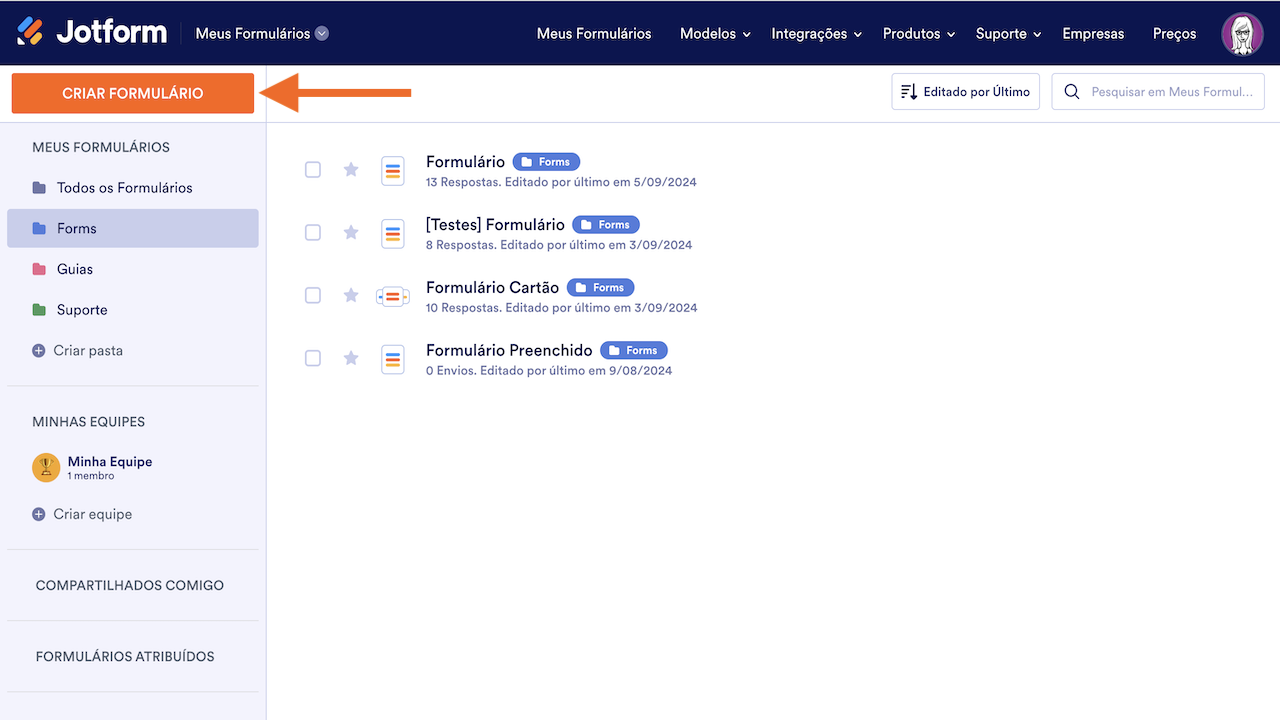 - Acesse Meus Formulários e selecione Criar Formulário no canto superior esquerdo da tela.