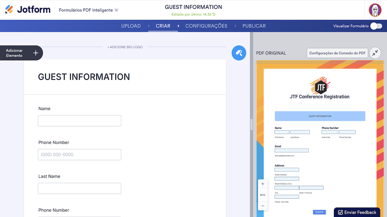 Feito isso, você verá o PDF importado ao lado do formulário online criado a partir dele. Observe que o formulário online não terá a mesma aparência do arquivo importado. O sistema fará o possível para buscar e clonar os campos do formulário a partir de seu arquivo em PDF.