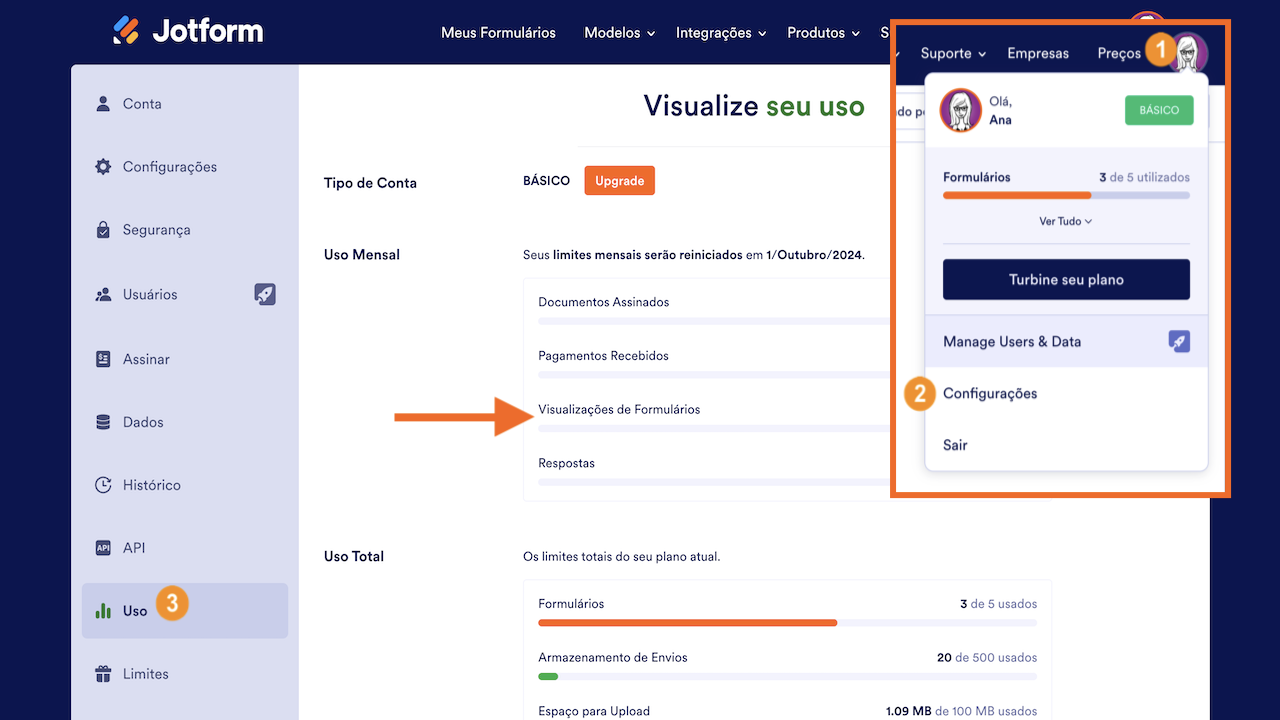 A Jotform possui um limite para cada plano chamado Visualizações de Formulários. Uma Visualização de Formulário é contabilizada sem que alguém visita ou visualiza seu formulário, independente de você tê-lo incorporado ou publicado diretamente. Você pode ler mais sobre isso em nosso artigo relacionado.