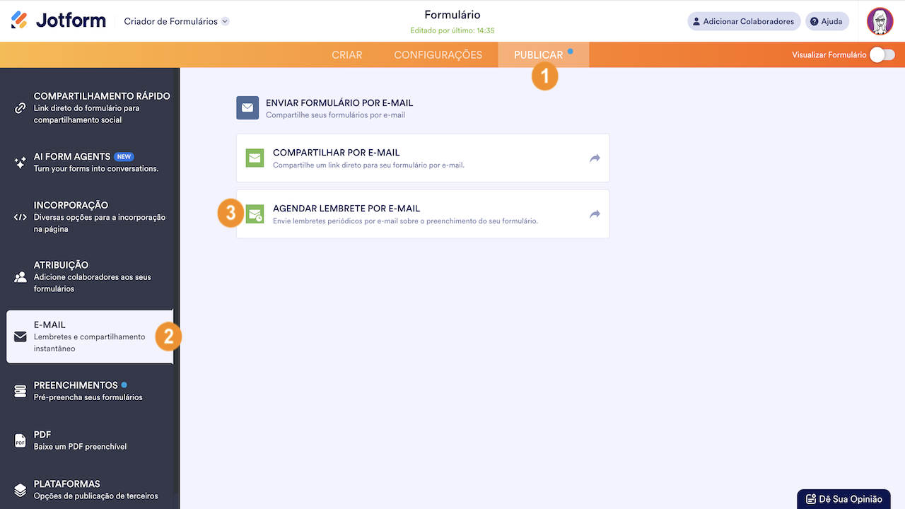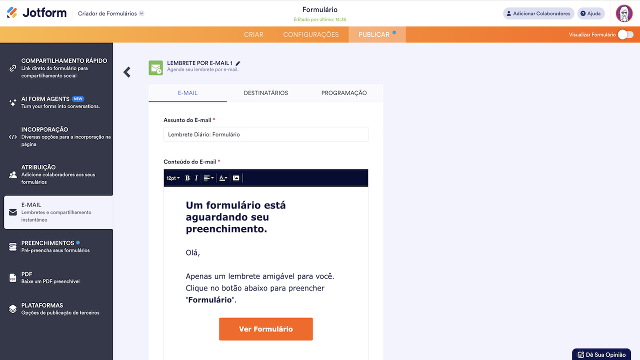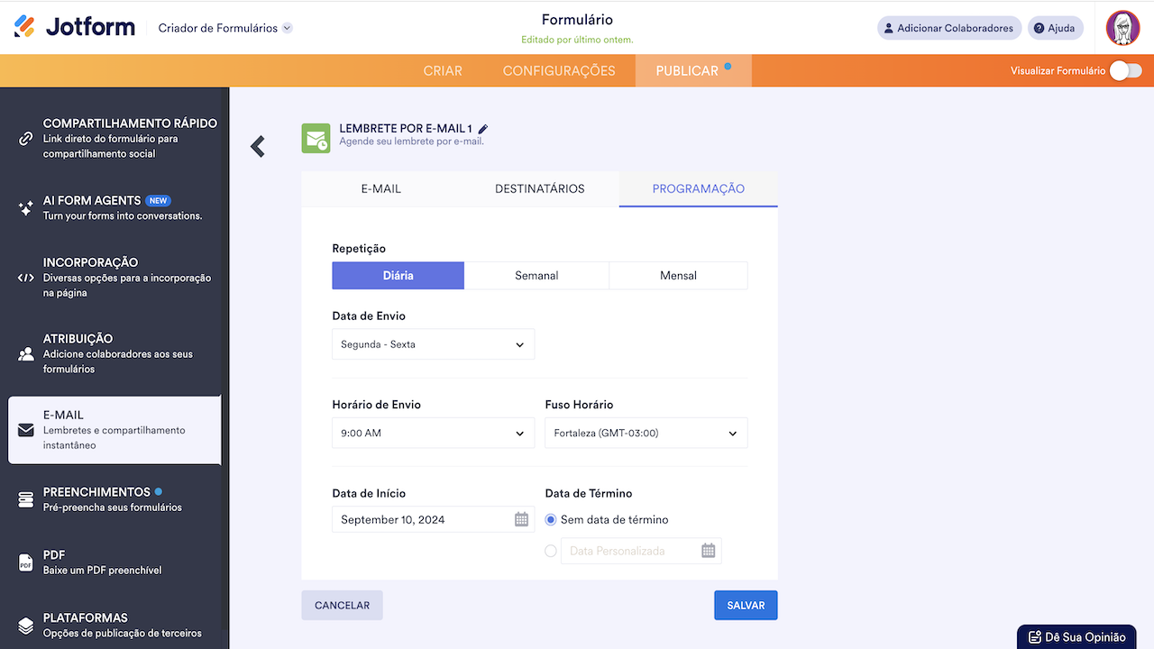 O envio de Lembretes por E-mail é um recurso da Jotform que permite que você envie e-mails diários, semanais ou mensais para notificar as pessoas sobre o preenchimento e envio do seu formulário. Este processo elimina a necessidade de informá-las sobre o preenchimento do seu formulário dentro do prazo estabelecido.