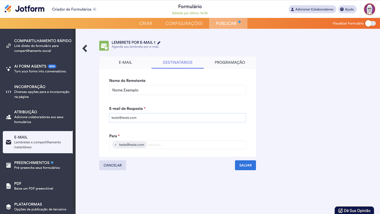 Na guia Destinatários, você pode fornecer o endereço para o qual o e-mail será enviado. Você também pode definir o Nome do Remetente e o E-mail de Resposta.