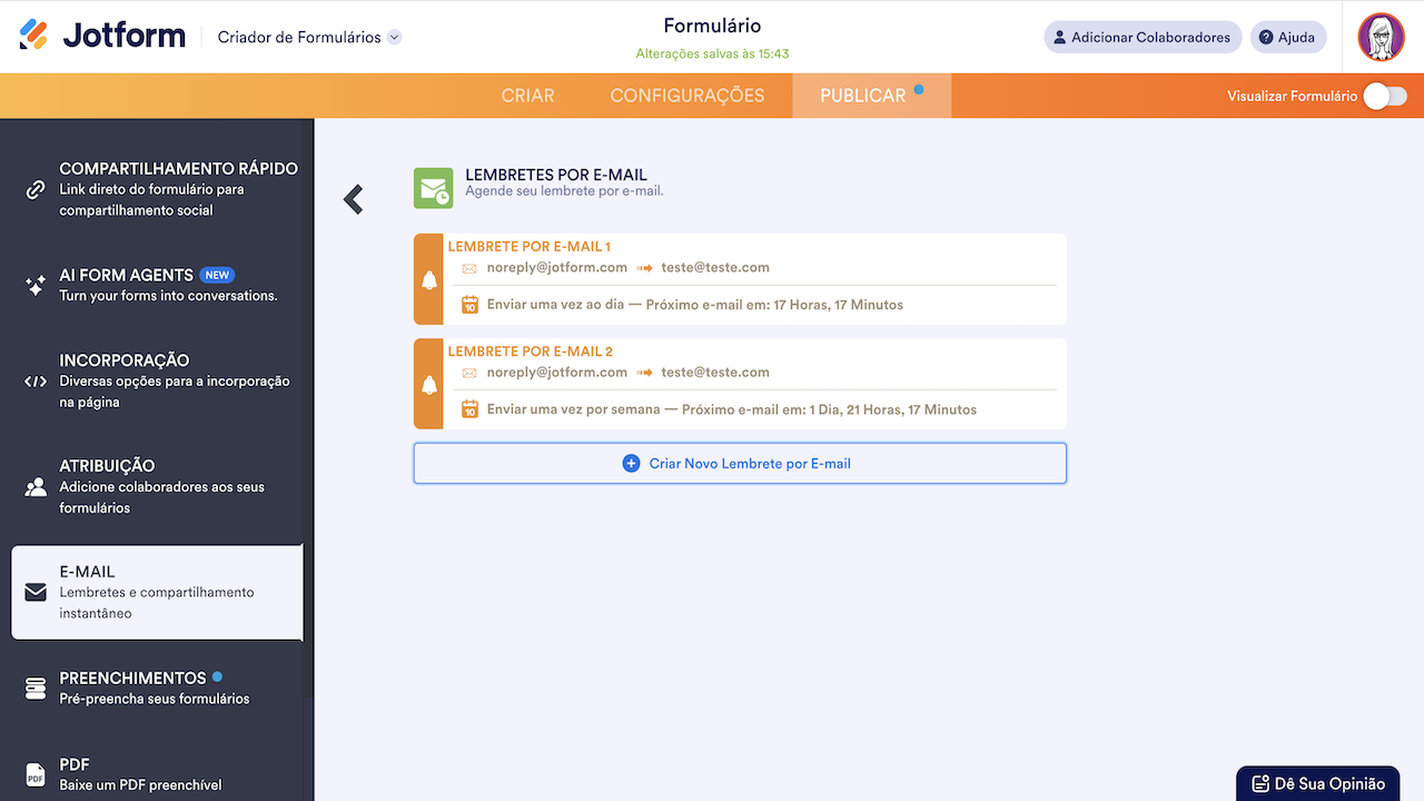 Caso já tenha algum lembrete por e-mail configurado para o formulário, você verá um painel listando os lembrete criados, suas informações de programação, bem como as formas tradicionais de criar, editar ou excluir e-mails.