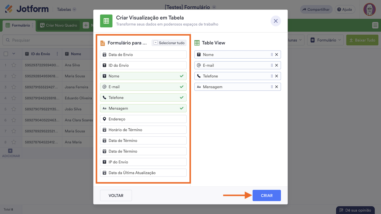 - Escolha as colunas a serem incluídas na aba e selecione Criar.