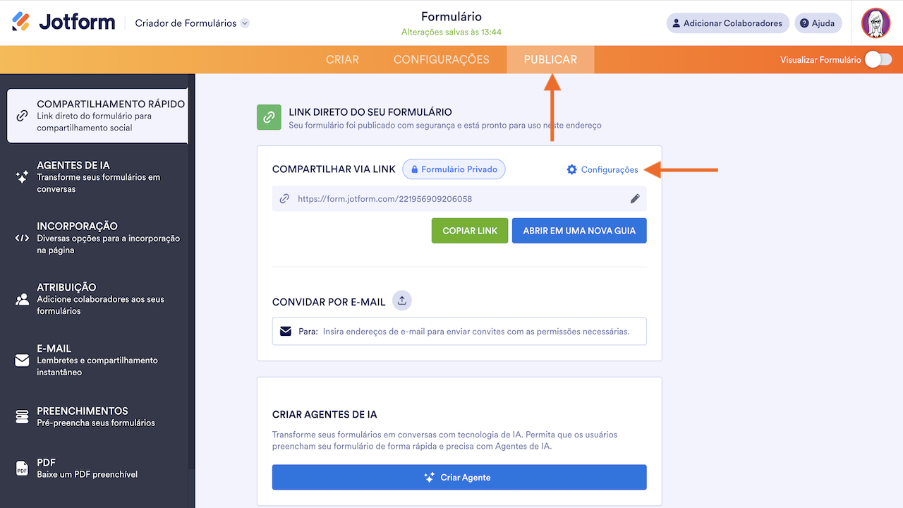 - No Criador de Formulários, acesse a guia Publicar.
