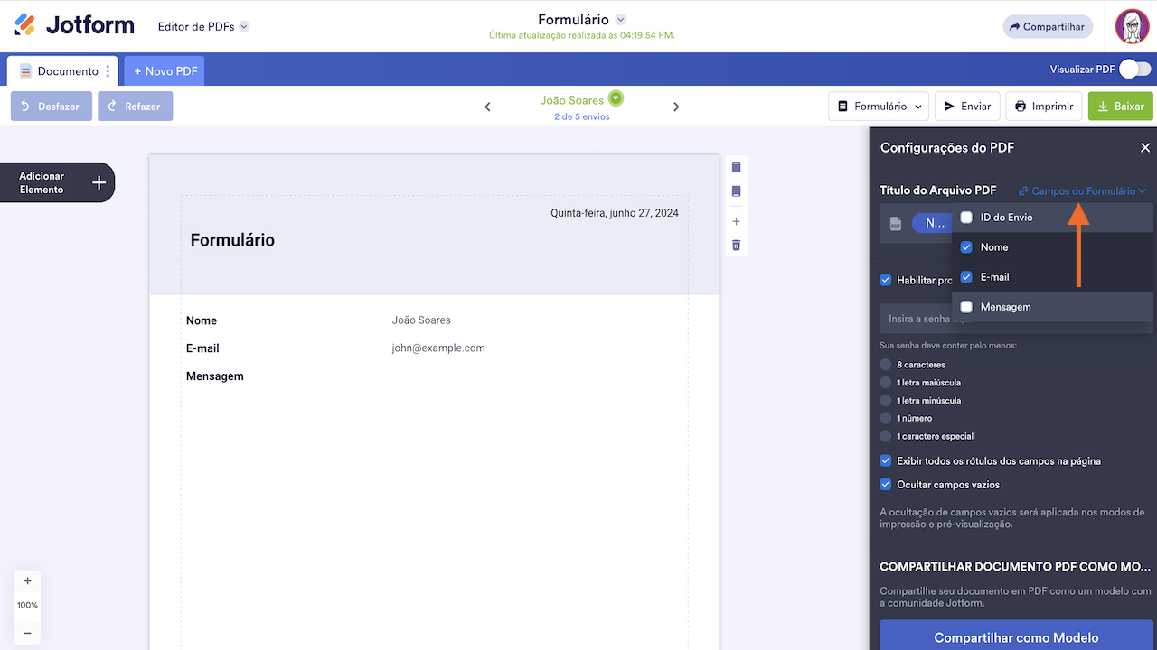 Para usar nomes de arquivos dinâmicos, abra o menu Campos do Formulário e selecione os campos a serem incluídos nos nomes de arquivos.