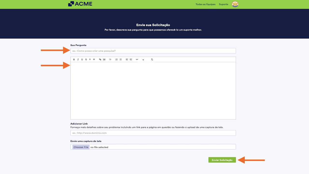 - Descrição — Forneça todos os detalhes da sua solicitação. Use a barra de ferramentas para formatar o texto e adicionar links e imagens, se necessário.