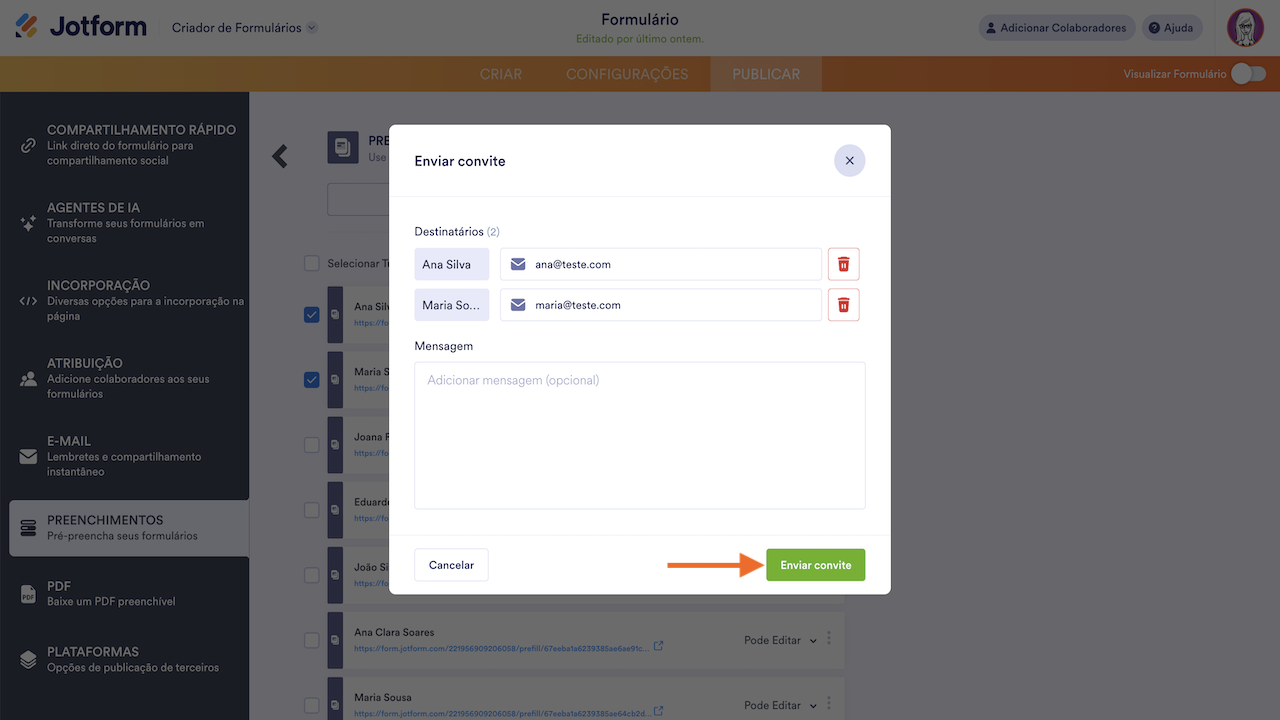 - Enviar convite — Clique neste botão para enviar os itens pré-preenchidos aos destinatários designados. Conforme observado abaixo, é possível enviar até 5 itens pré-preenchidos por vez.