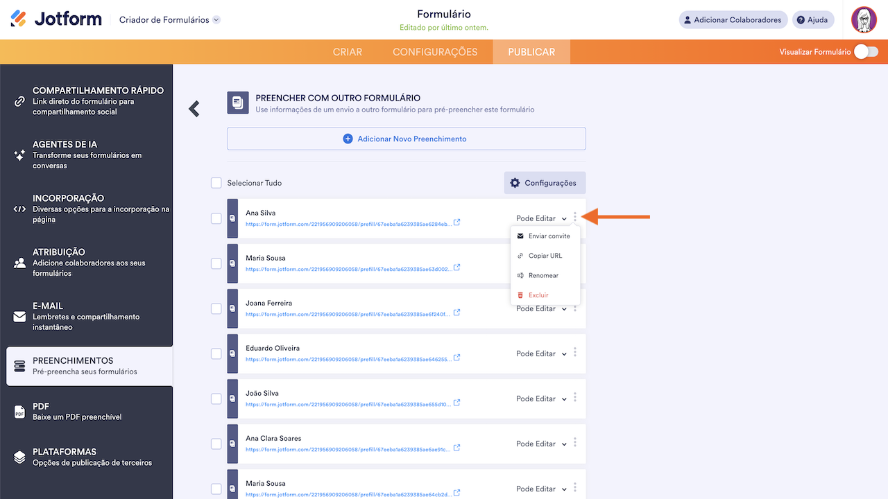Em cada URL pré-preenchida, clicar no menu de 3 pontos permitirá que você faça o seguinte: