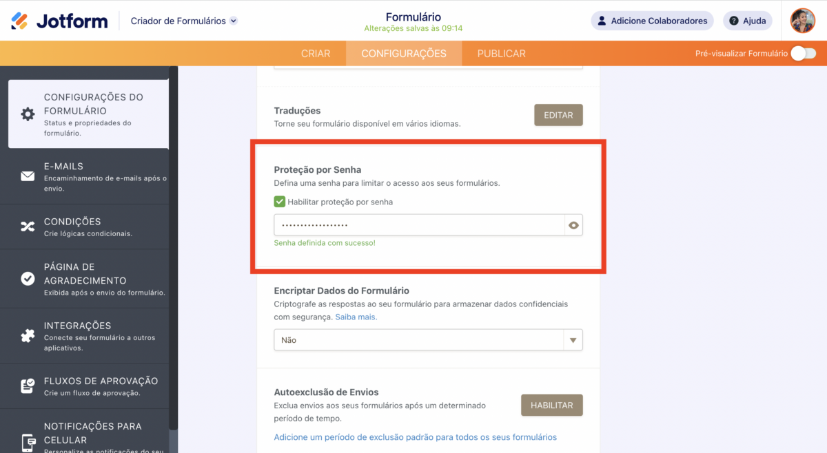 Este conhecimento pode ser útil caso você precise impedir que potenciais respondentes submetam envios ao formulário após a configuração e compartilhamento da senha.