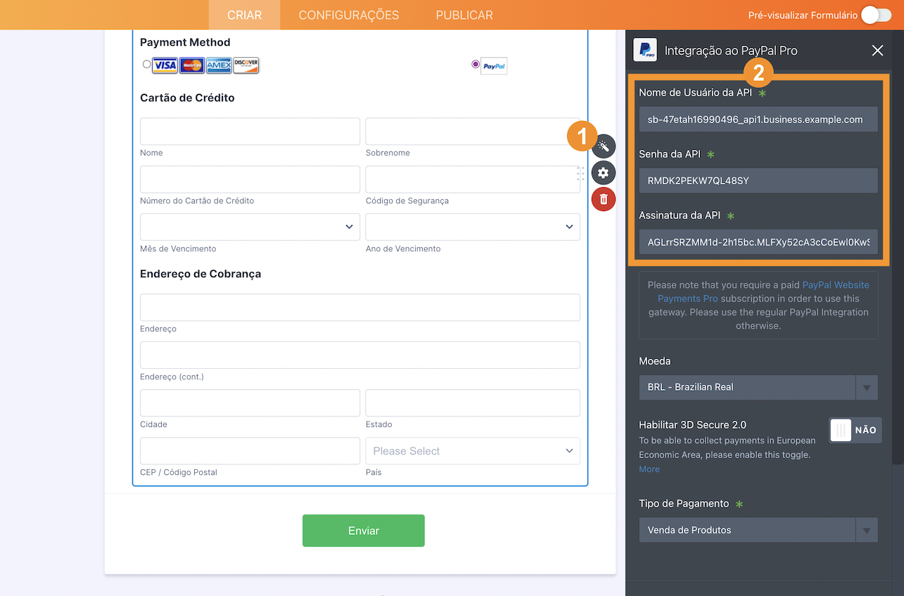 - Feito isso, insira estas credenciais nas Configurações de Pagamento da sua integração ao PayPal Pro no Criador de Formulários.
