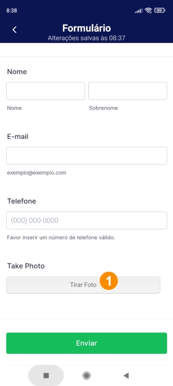 Abra o formulário usando o app Jotform Formulários Móveis, como Preenchimento normal ou em Modo Kiosk. Clique no botão Tirar Foto, pressione o ícone da câmera para tirar uma foto e pronto.