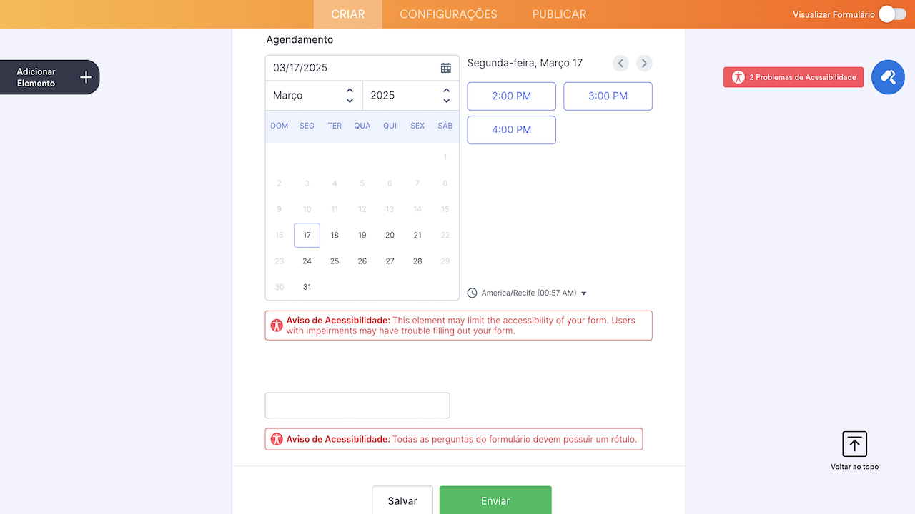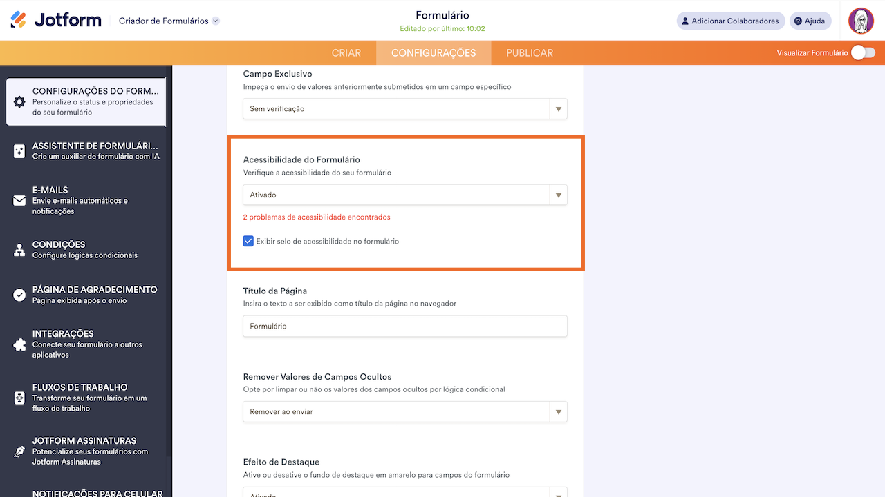 Confira abaixo os passos para ativar o recurso de Acessibilidade do Formulário: