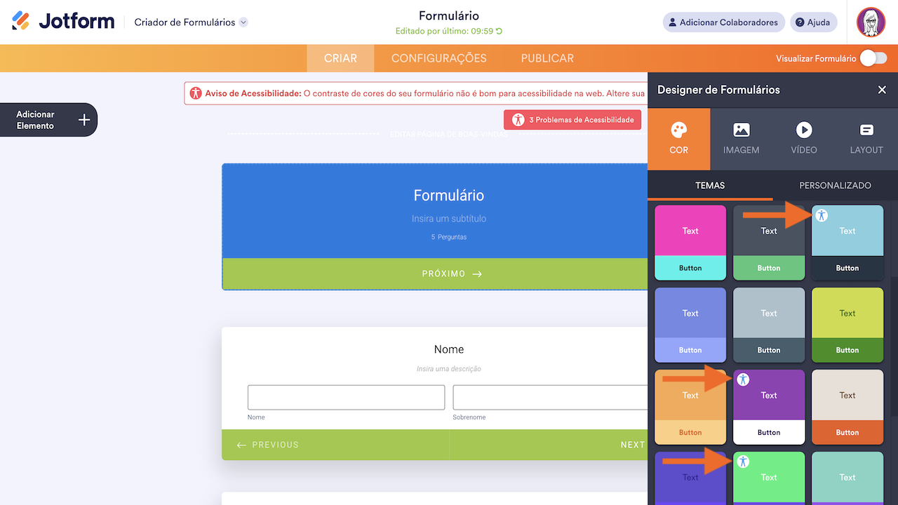 O Criador de Formulários analisará o formulário e, caso seja detectado algum problema de acessibilidade, avisará sobre os elementos que devem ser corrigidos para torná-lo acessível. Por exemplo, se um campo não possuir rótulo, uma imagem não incluir texto alternativo, um widget ou campo não suportado for usado ou outros problemas forem detectados, você verá avisos no editor.