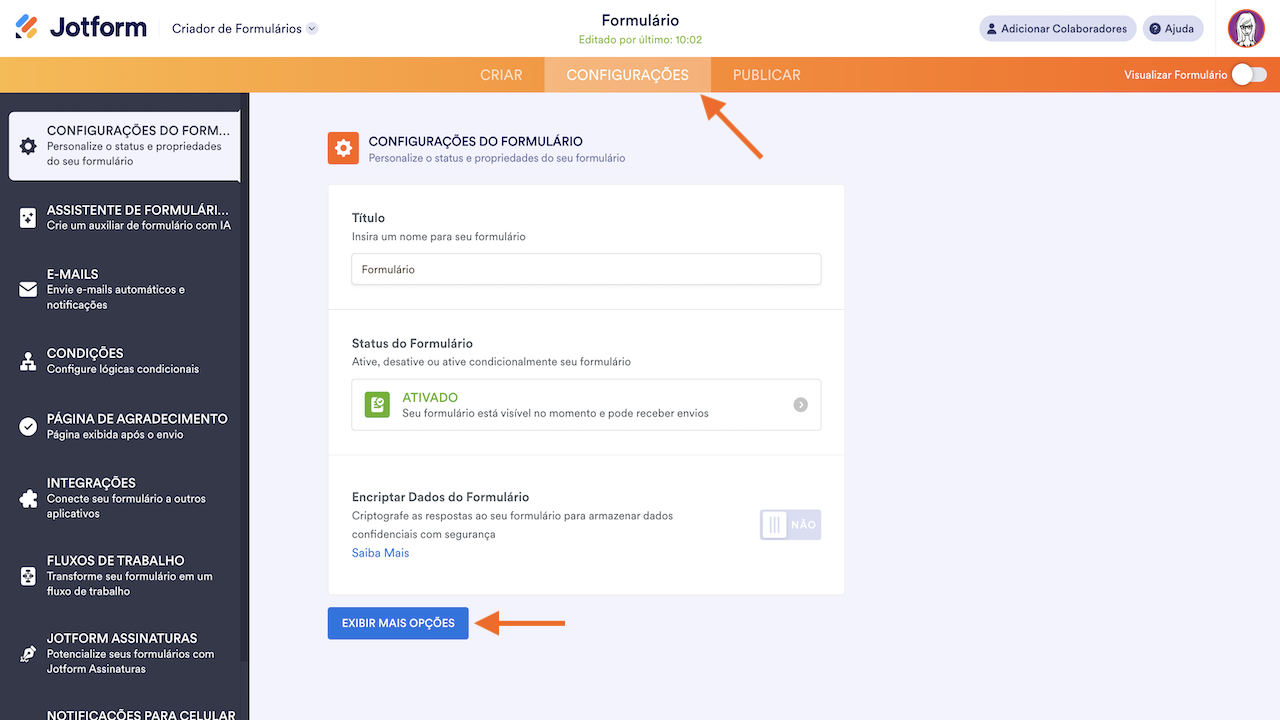 - Na seção Configurações do Formulário, clique no botão Exibir Mais Opções.