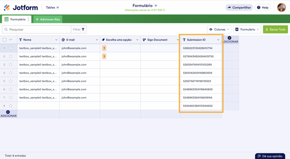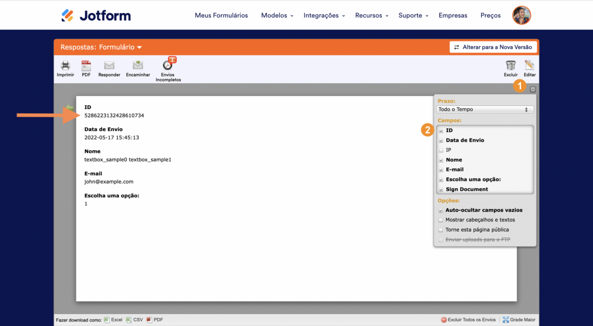 Sempre que alguém submete uma resposta a um dos seus formulários, é atribuído ao seu envio uma longa sequência de números denominada ID do Envio (Submission ID).