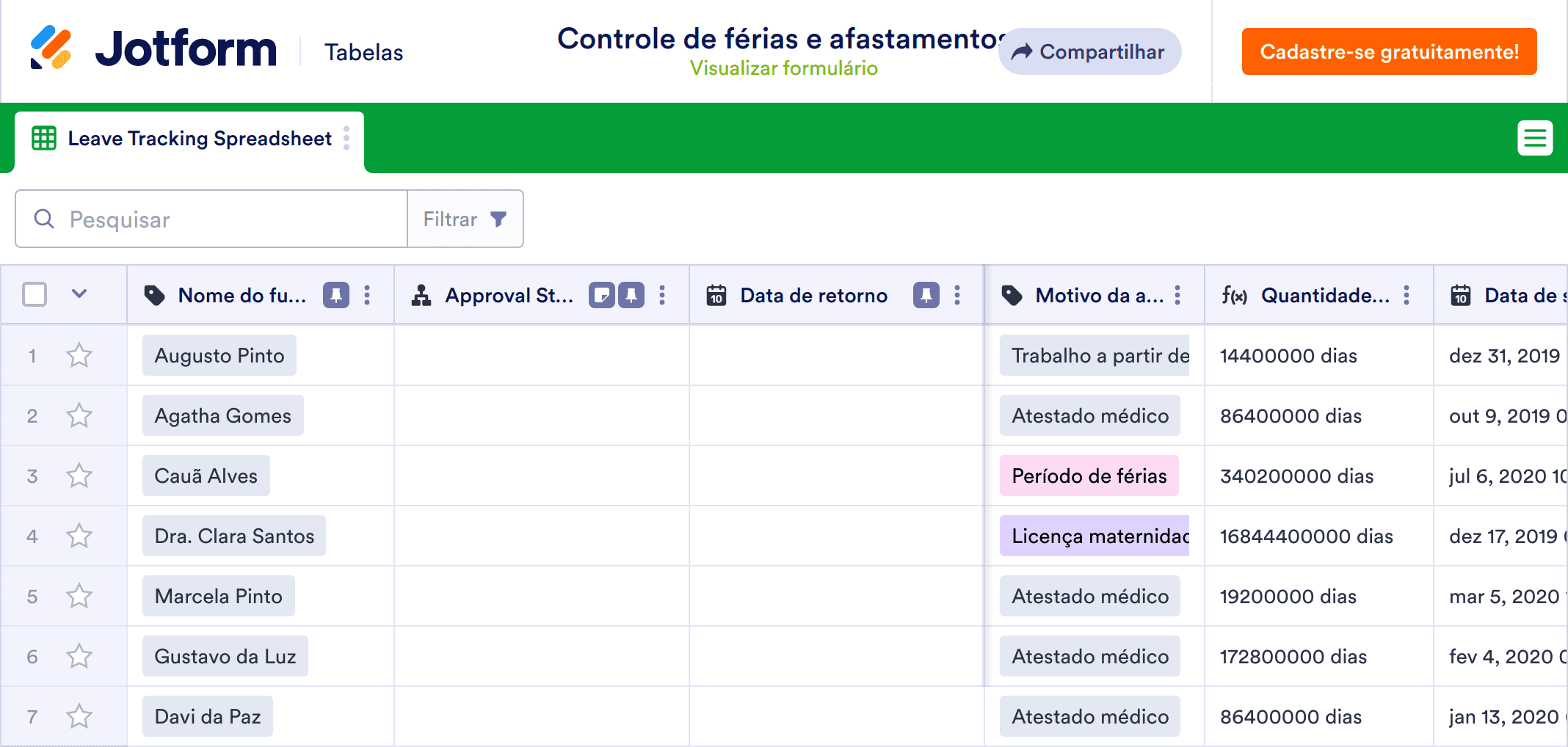 A planilha de controle de férias e afastamento está pronta para ser usada, mas sinta-se livre para personalizá-la do modo que você preferir. Com o nosso sistema de arrastar e soltar é fácil adicionar linhas, colunas, abas e etiquetas para organizar as informações dos seus funcionários. Você pode até criar um formulário de folga que preencherá imediatamente sua planilha assim que os funcionários enviarem sua solicitação! Gerencie a presença de funcionários e simplifique seu processo de rastreamento de afastamentos com mais eficiência com nossa planilha de rastreamento de férias e afastamentos.