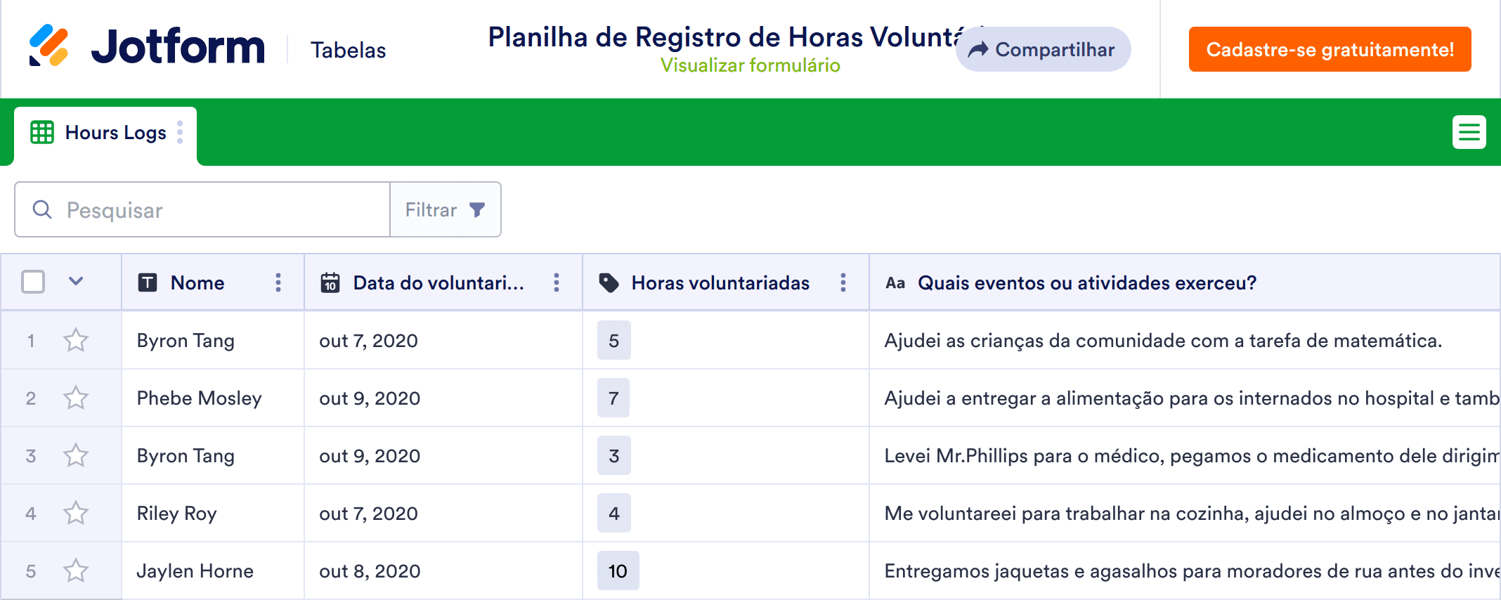 A planilha de controle de horas de voluntários é utilizada para acompanhar o trabalho dos voluntários nas organizações sem fins lucrativos ou de caridade. Com a Planilha gratuita de Registro de Horas Voluntárias da Jotform, os voluntários podem preencher o formulário de registro de horas anexo, ou um membro da organização pode preencher manualmente, ou você pode enviar um arquivo Excel, ou CSV para manter as horas registradas em um local seguro e online. Acompanhe as horas, detalhes para contato, descrição das atividades realizada e muito mais.