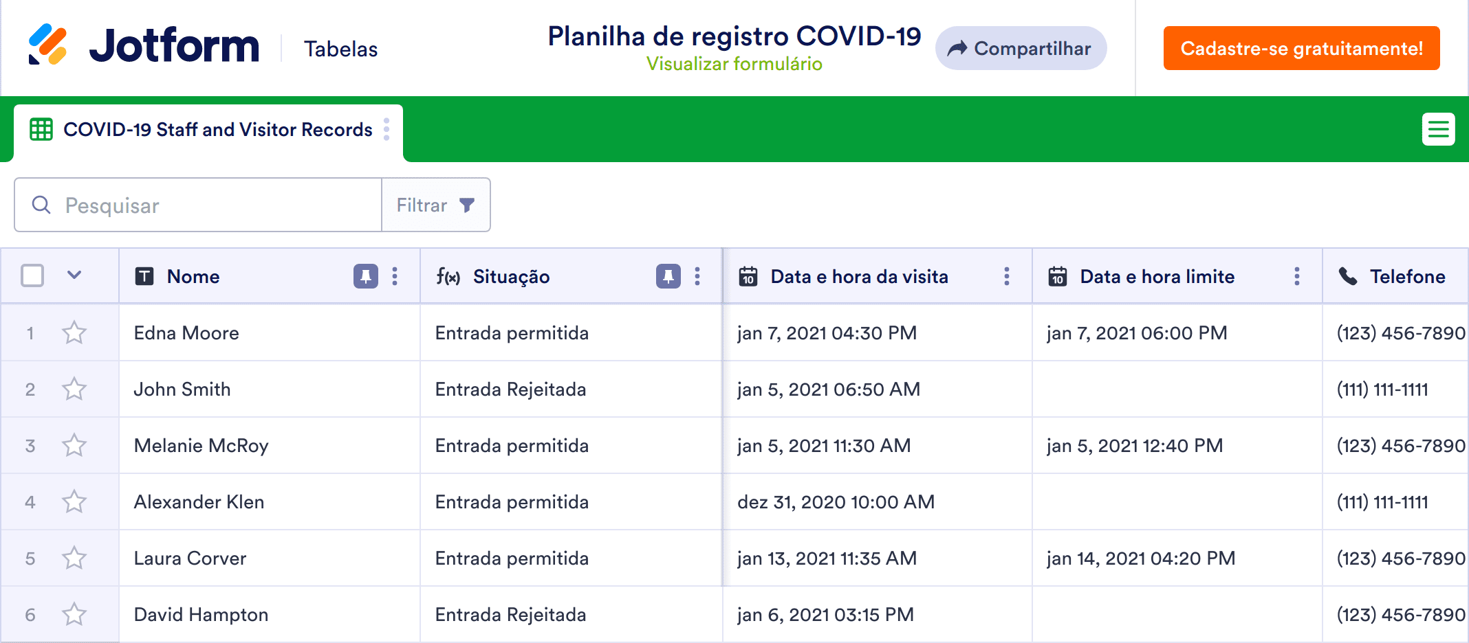 A planilha de registro do COVID-19 é usada por organizações de saúde para rastrear todos que entram em seu prédio, facilitando o rastreamento de contatos e ajudando a reduzir a propagação do COVID-19. Mantenha um registro completo de visitantes com a planilha de Registro COVID-19 online gratuita da Jotform! Preencha a tabela manualmente ou peça às pessoas que insiram suas informações no formulário de registro de funcionários e visitantes do COVID-19 anexado. Os registros do formulário serão automaticamente enviados para a planilha online, fáceis de acessar e compartilhar em qualquer dispositivo.