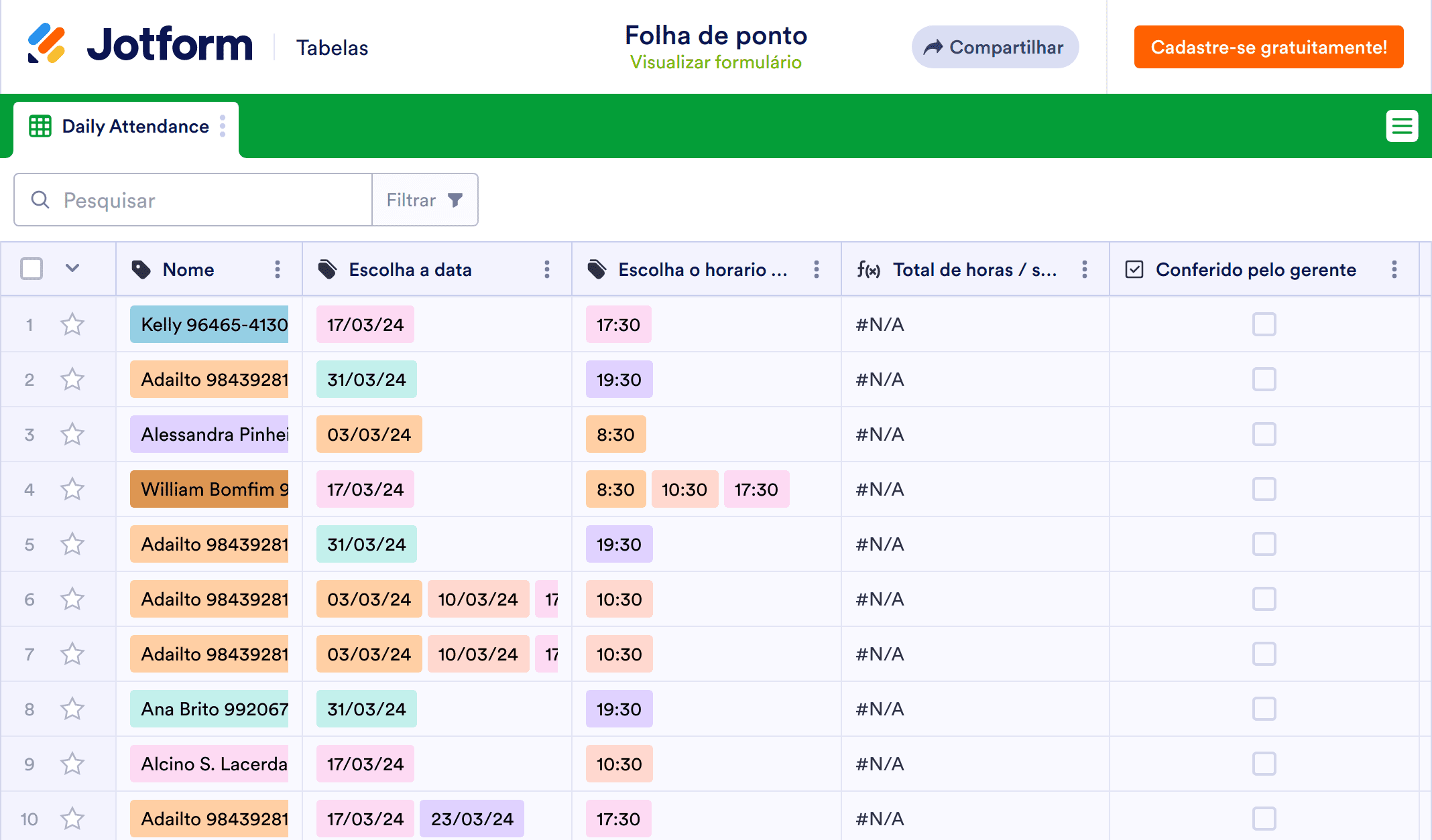 Não importa a série que você leciona, nossa planilha de presença de aluno vai te ajudar a acompanhar o nível de presença dos seus alunos. Simplesmente informe o nome do estudante e as informações da presença utilizando o seu computador ou celular — ou, utilize nosso formulário online para que os alunos marquem a presença ao final da aula. Os envios serão automaticamente gravados na planilha para que você possa facilmente visualizar, baixar em Excel ou CSV, ou imprimir os dados. Você não precisará aprender a programar para personalizar a sua planilha. Facilmente arraste e solte os elementos que deseja adicionar, como linhas e colunas, altere as cores das etiquetas, separe a tabela por classes e filtre os dados por grupos. Quanto terminar de personalizar, você terá uma planilha eficiente e prática que não tomará o tempo de aula para manter o registro de presença de seus alunos e você poderá focar mais no ensino. Depois disso, você nunca mais voltará para folhas de presença.
