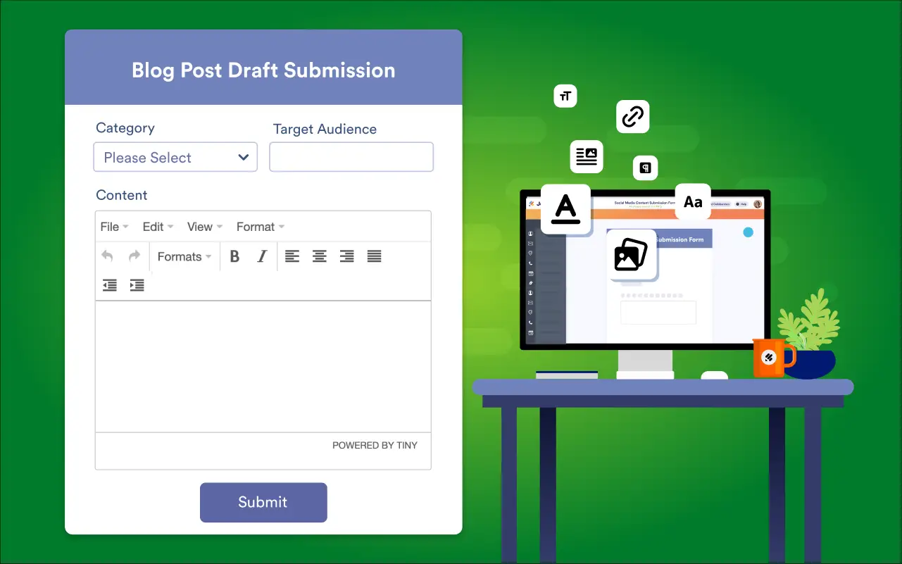 Deseja utilizar conteúdos rich media em seus formulários online? Jotform possui widgets para isso. Nossos widgets o ajudarão a adicionar áudios, vídeos e imagens ao seu formulário. E a melhor parte? Eles são gratuitos e fáceis de usar.