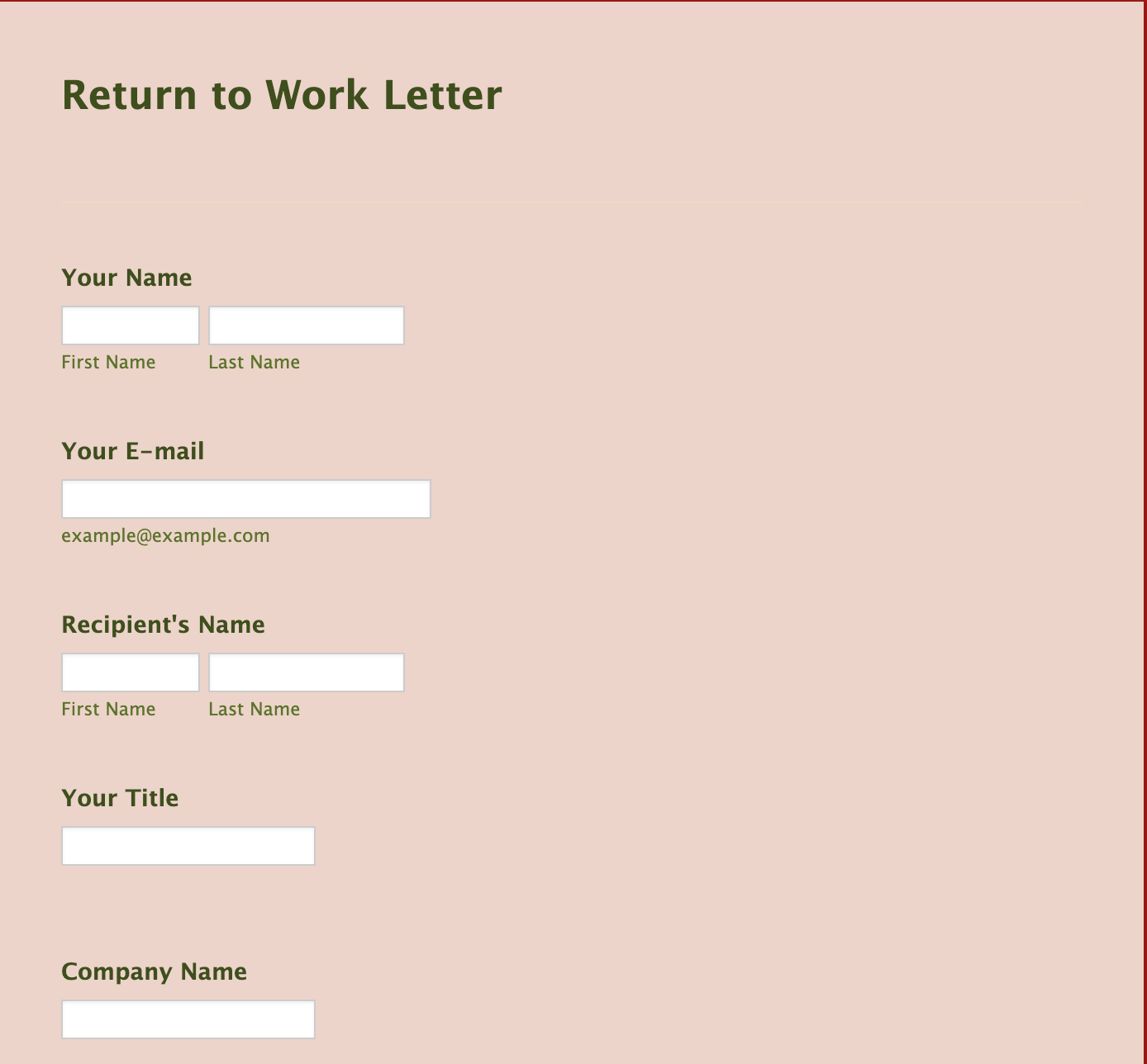 Even better, companies may consider creating written documentation for employees to record any concerns. A form creator like Jotform, which offers customizable return to work templates, is a great solution to make sure your transition to the office runs as smoothly as possible.