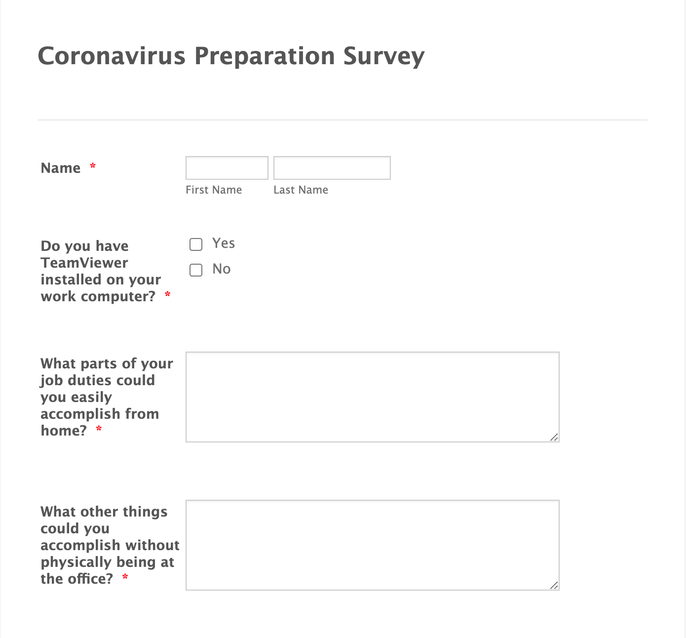 The last example I wanted to show is Coronavirus work from home preparation survey, you may be thinking that I’m like a year and a half too late on this example, but hear me out. So again, if you decide to use a template, you can change whatever you need to you can change what this is called. But I do think that regardless of what you’re calling it and how you’re using it, it is important to be aware of what you might be facing if there is a long term work from home situation in the future. I think at the beginning of the pandemic, we were clearly very largely unprepared to be home for a long period of time. Now most of us are perfectly fine working from home and many of us are still working from home. But as we start to adjust to being back in the office, maybe we get a little bit lacking in the work from home space we’ve created, maybe you made a home gym, or a guest room, or, in my case, goes back to solely being used for a dining table. You know, you just want to make sure again, that you’re aware of what your employees are facing. Again, this is something maybe that you send out annually or ask new employees to fill out. You know, the first question here after name is a particular software, and answer some questions about what you can and can’t easily do at home. Then some hardware questions as well. So this will help the company keep tabs on again, how prepared anybody is limitations that you might be facing if there is a future situation. And might give you a reminder of people you need to bug to install particular software.