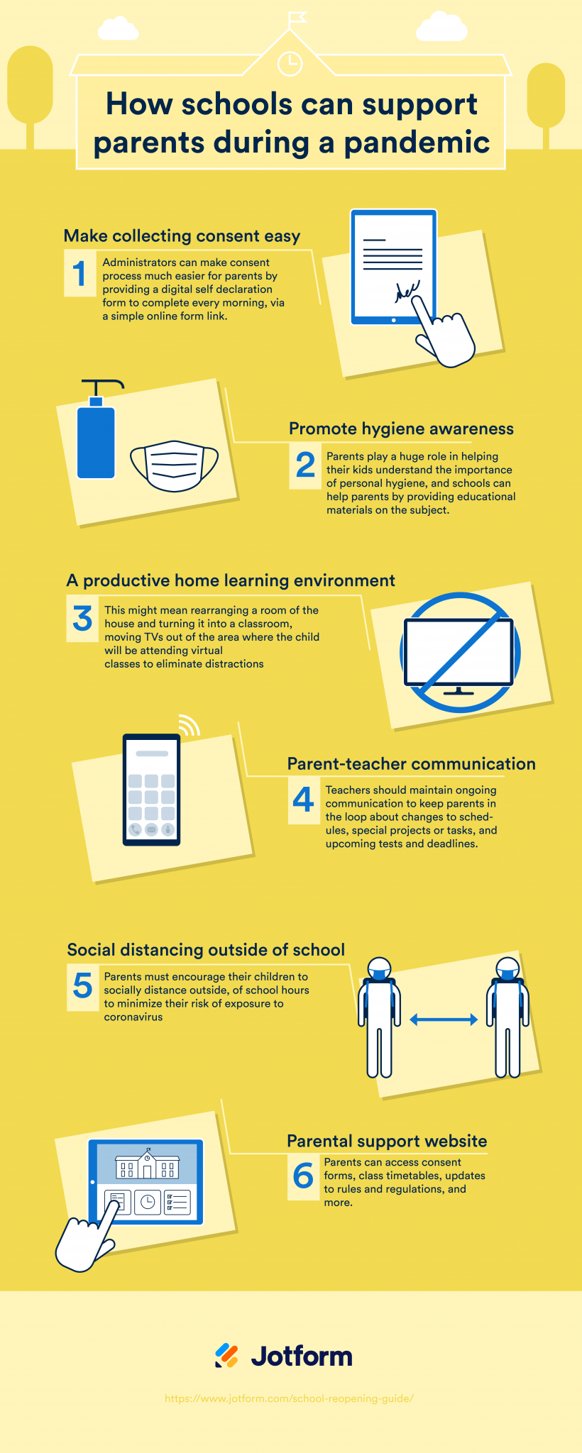 A whole lot more goes on at school besides teaching. Things like collecting student data, registering new students, gathering student feedback, disciplining students, and managing permission and parental consent are examples of administrative processes that can easily go digital, thereby becoming more efficient, streamlined, and contactless. Even before the pandemic, many schools were already digitizing their back to school tasks with JotForm. In a socially distanced world, digitization is now a must.