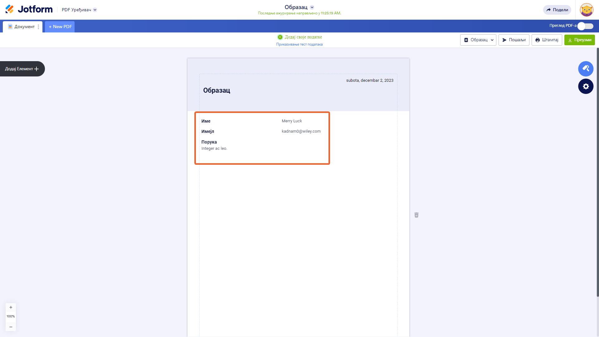 Уколико твој образац још нема никаквих пријава, PDF уређивач ће приказати насумичне податке.