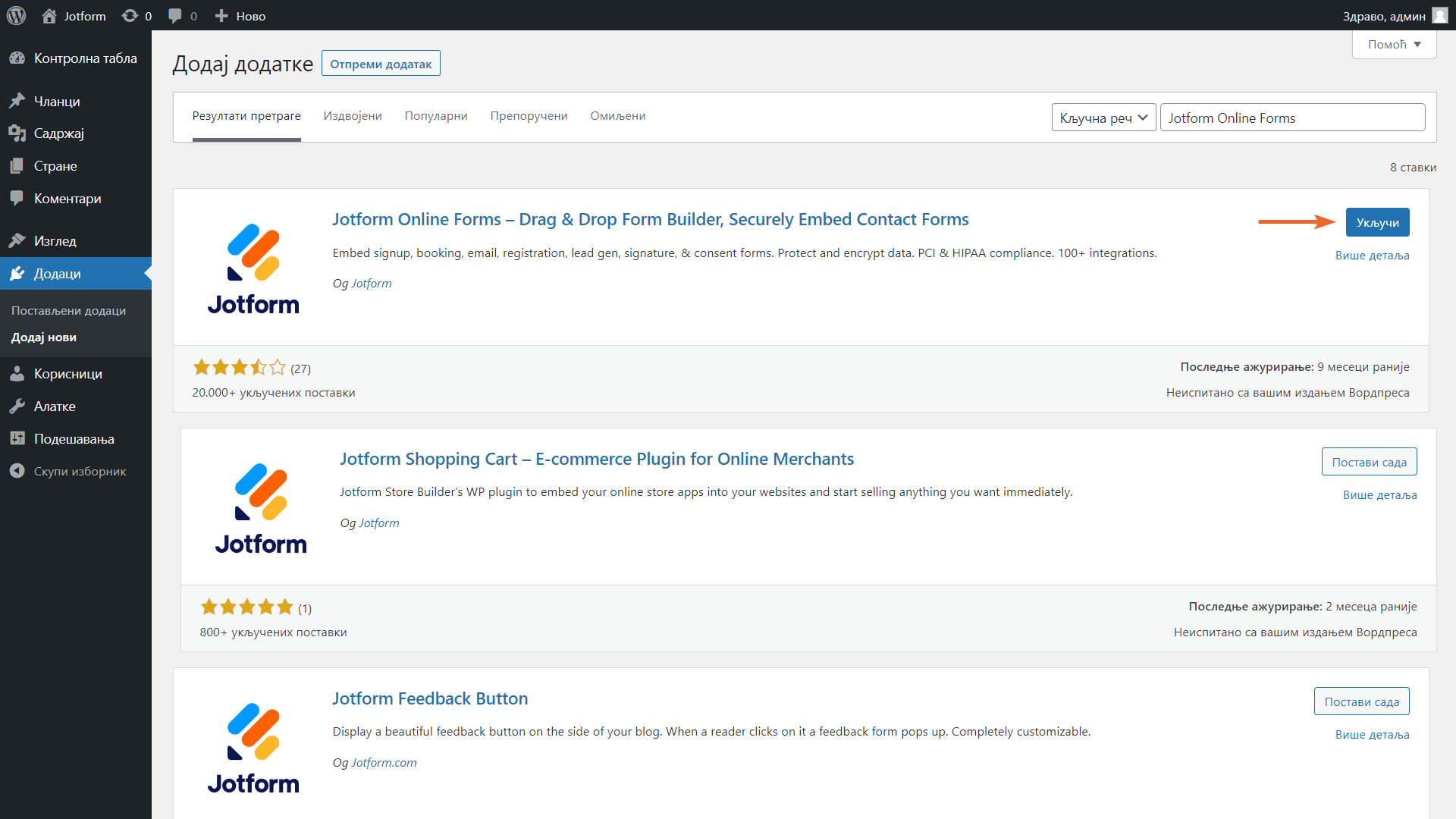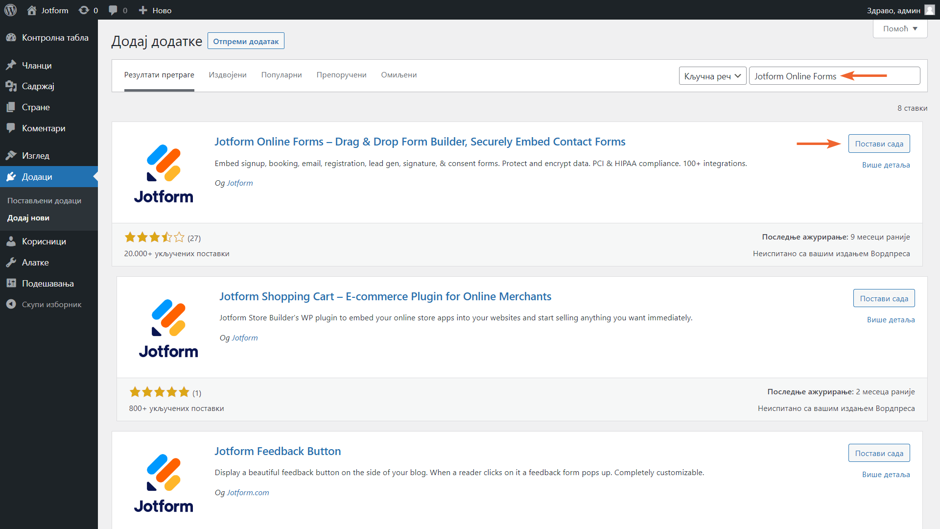 - На страни за додатке, претражи и инсталирај Jotform Online Forms.